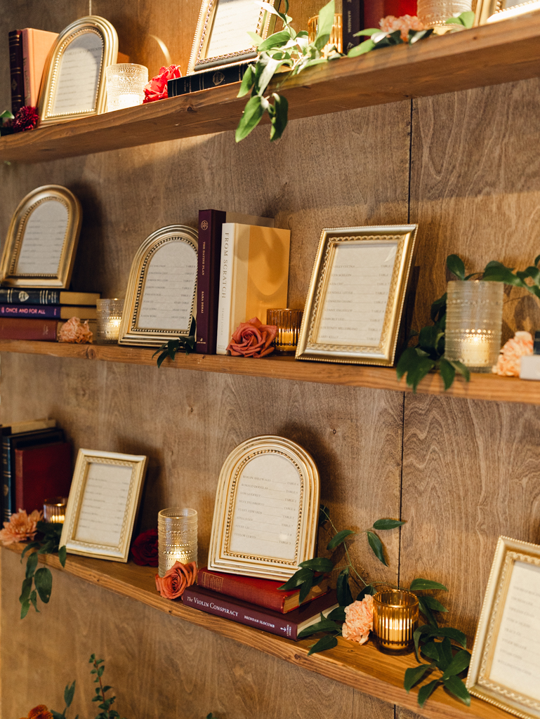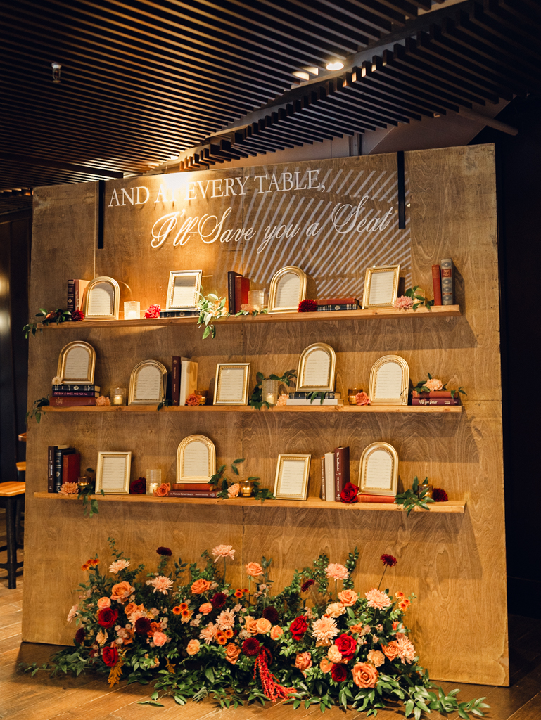 The book theme showed up throughout their decor as well, including a jaw dropping escort wall. Underneath the words “and at every table, I’ll save you a seat”, guests could find their table numbers amongst the couple’s favorite reads, including classics by Shakespeare and George Bernard Shaw and modern stories by Nicholas Sparks and Sarah Dessen.